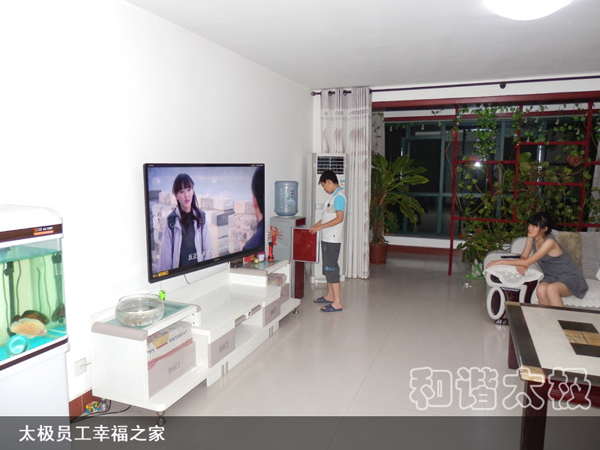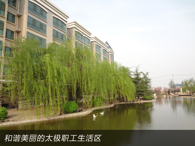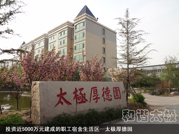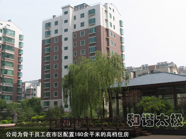 2008年,太極公司投資近8000萬元建成了職工公寓樓3座,戶外綠樹溪湖環(huán)繞,每戶面積170平米,統(tǒng)一配置60寸夏普電視等。所建成的職工單身公寓樓采用四星級標準,共176間房,人均戶面積50平米,統(tǒng)一配置電視、網(wǎng)絡(luò)、洗浴間、床柜、空調(diào)、暖氣、桌椅等。而且單身公寓內(nèi)設(shè)有3000余平方米的生態(tài)園林和高檔游泳池,一年四季綠樹茂盛常春。